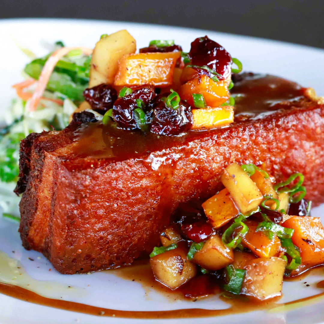 Two of our crispy polenta cakes stuffed with vegan mozzarella and cheddar cheese. Served with charred spicy peppers, local greens, and corn succotash and topped with lemon vinaigrette.